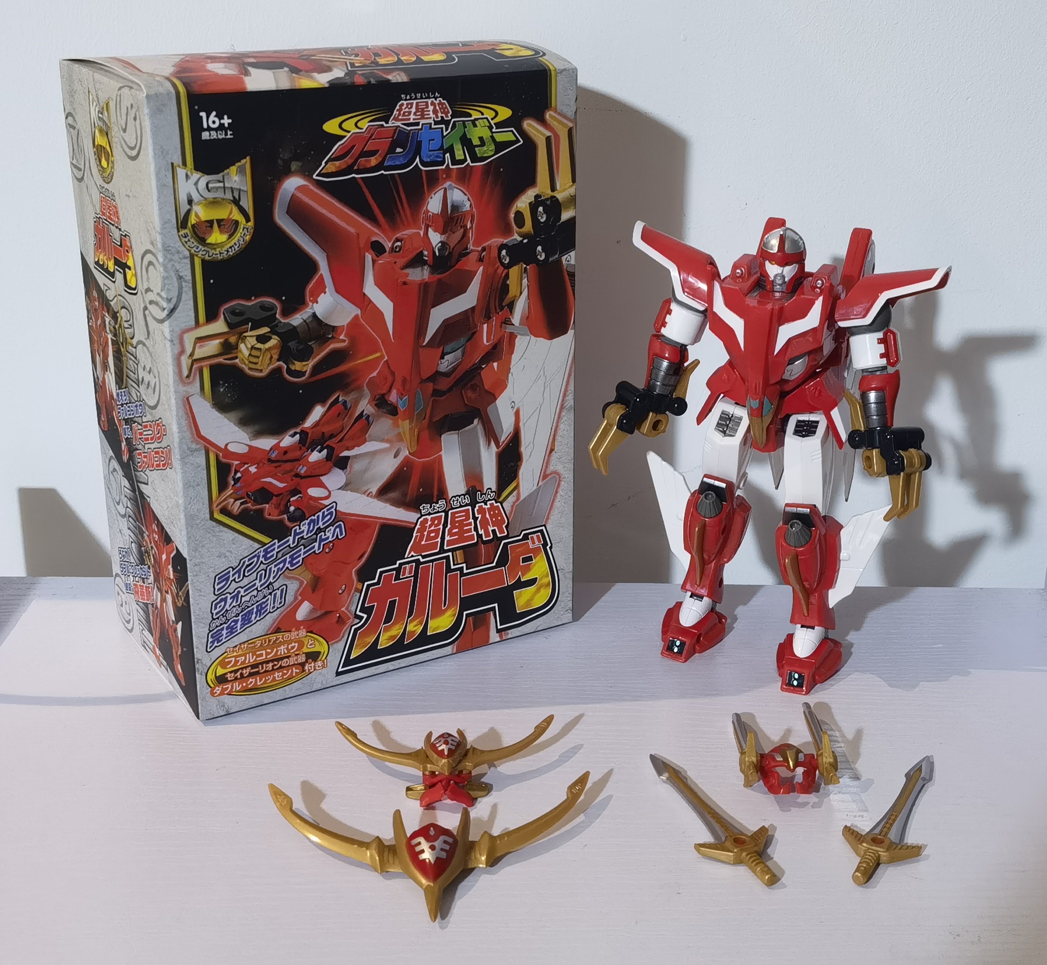 当年上幼儿园的时候看的超星神,那时买到是一种包装简单、附赠光碟的玩具,没有配件,也无法实现赛沙装置。曾经在幼儿园里看到过一个同学有这款能够赛沙装置的迦楼罗,但那时也不知道在哪能买到。大学的时候又重新从头到尾完整看了一遍超星神,想在网上买相关玩具,可惜官方没有再出过新品,二手市场的价格也很劝退。